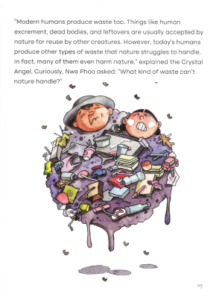 Das Kinderbüchlein in Myanmar-Sprache und Englisch erklärt das Abfallproblem und den Umgang mit den verschiedenen Abfällen der modernen Gesellschaft. Recycling und Kompostierung wird erklärt. Ein Spiel dient der Vertiefung des Gelernten.